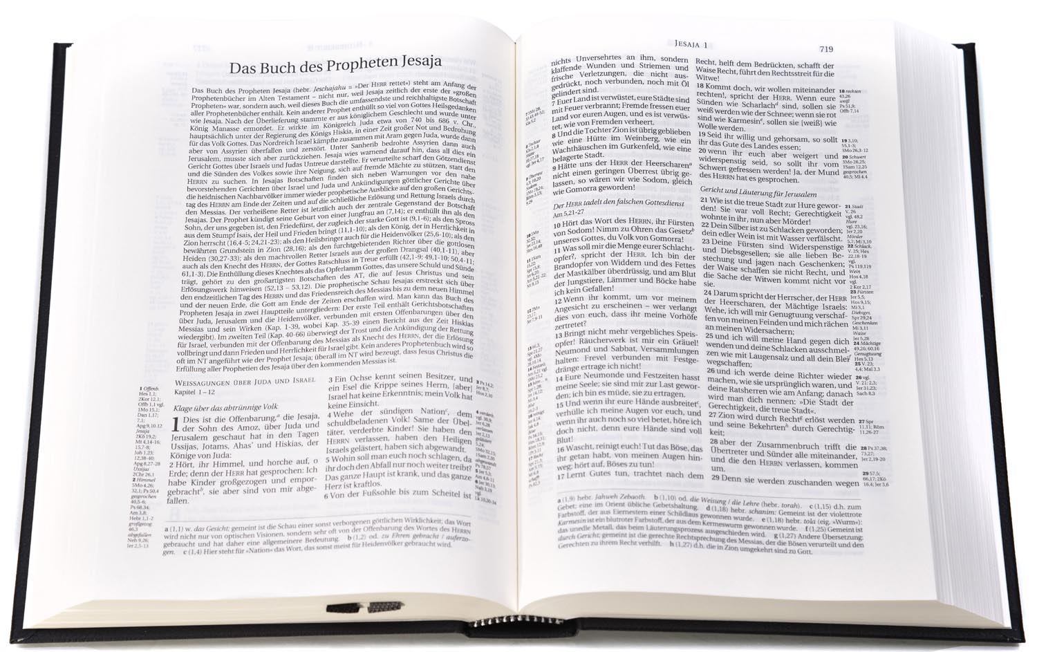 Neben Überschriften zur Kapitelübersicht, Parallelverweisen und textlichen Anmerkungen beinhaltet diese kompakte Ausgabe einen ausführlichen Anhang mit Sach- und Worterklärungen, Diagrammen und Tabellen, diversen Abbildungen, farbigen Karten sowie verschiedenen Bibelleseplänen.