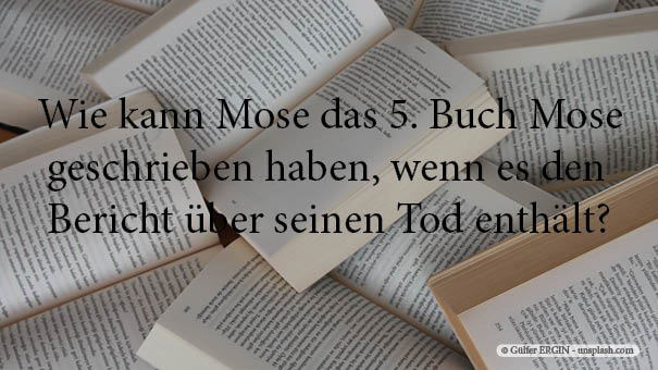 Obwohl die orthodoxen Christen und die Juden gleichermaßen behaupten, Mose habe die ersten fünf Bücher des Alten Testaments geschrieben, leugnen manche Leute seine Autorschaft für das fünfte Buch, Deuteronomium. Sie tun dies teilweise mit der Begründung, dass Kapitel 34 den Bericht von Moses Tod enthält. Da niemand einen Bericht über seinen eigenen Tod schreiben kann, argumentieren sie, heißt das nicht, dass das Buch des Deuteronomium nach der Zeit des Mose geschrieben worden sein muss?