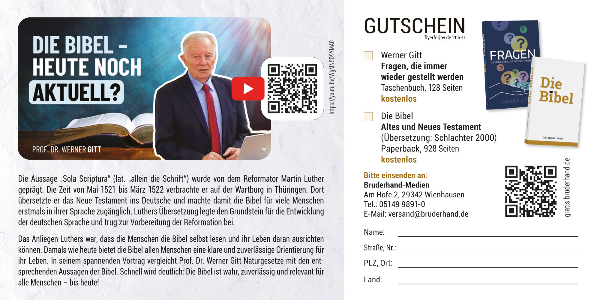 Dieser Flyer möchte motivieren, den Vortrag von Werner Gitt "Die Bibel – heute noch aktuell?" auf YouTube anzuhören.